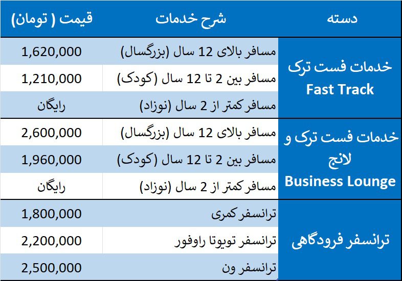 هزینه ی خدمات فست ترک و بیزینس لانج (Business Lounge) به شرح تصویر زیر می باشد: